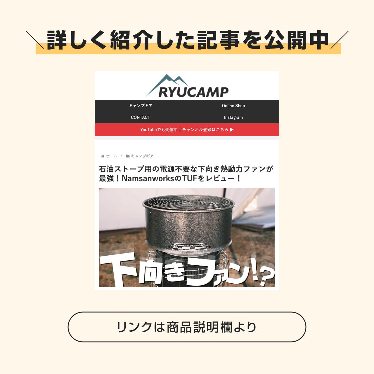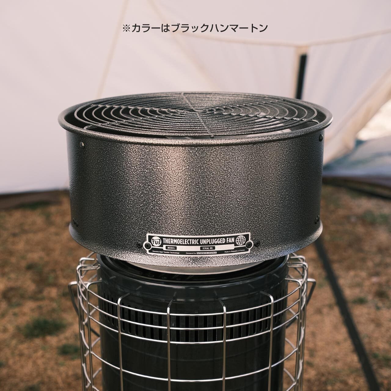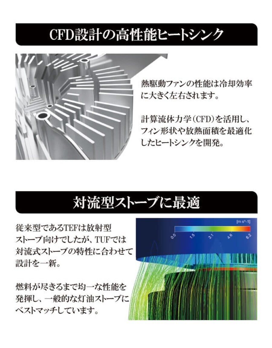 TUFは、ストーブの熱で発電して羽根を回す熱駆動ファンで、電池もコンセントも不要。