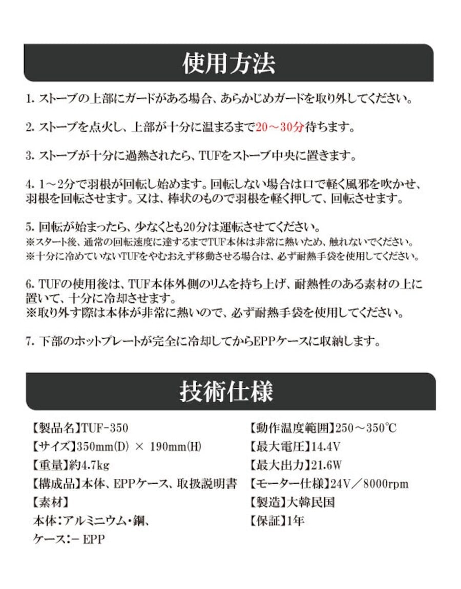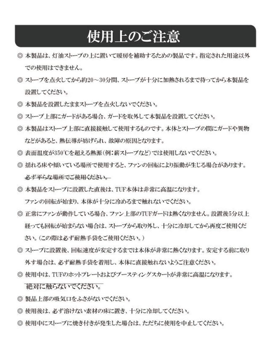 ◎ 正常にファンが動作している場合、ファン上部のTUFガードは熱くなりません。設置後5分以上経っても回転が始まらない場合は、ストーブから取り外し、十分に冷却してから再度ご使用ください。(この際は必ず耐熱手袋をご使用ください。)