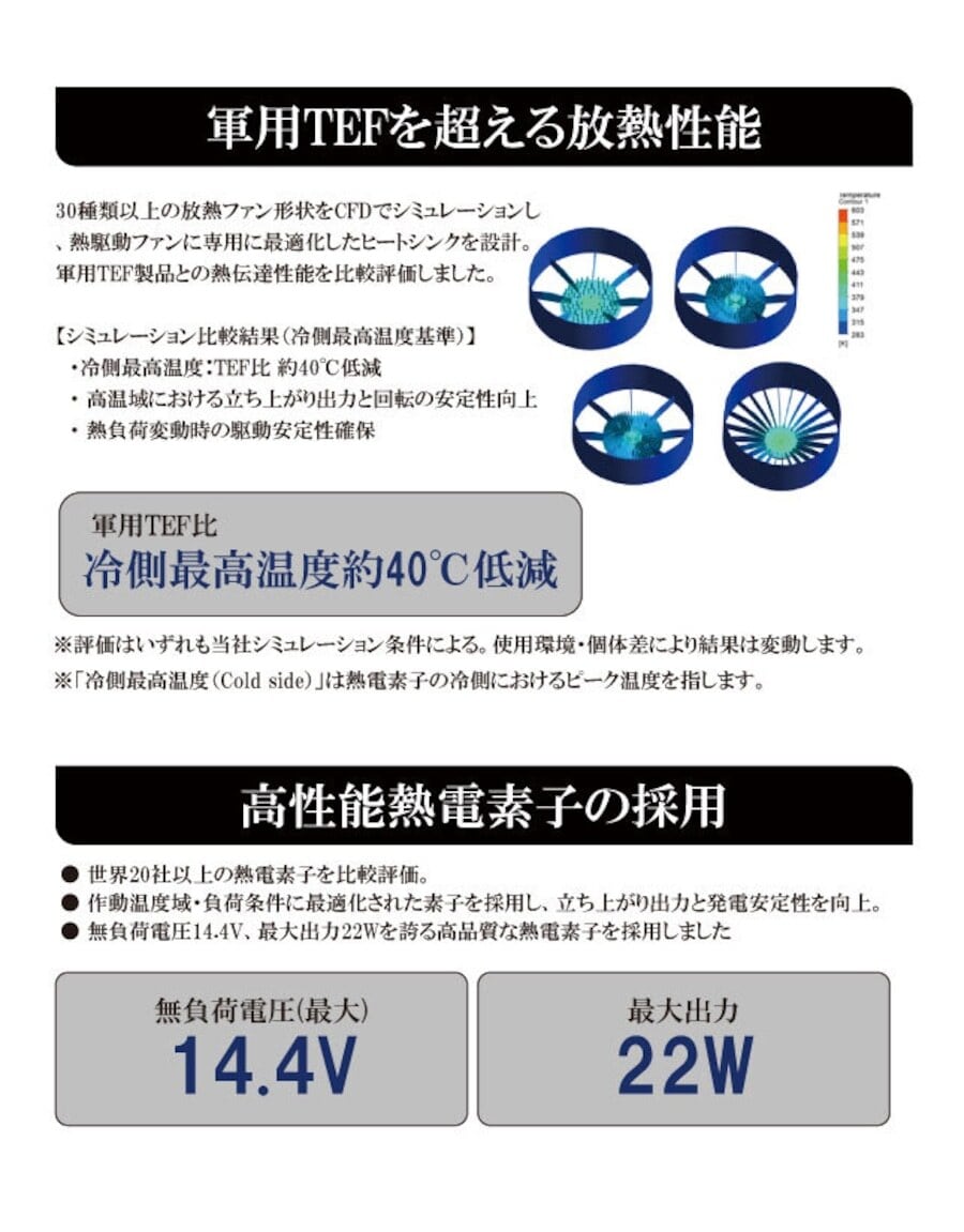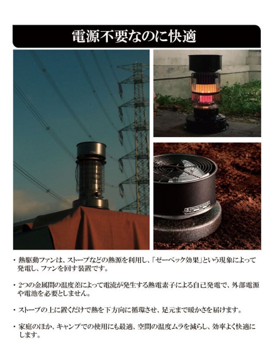 ・ 熱駆動ファンは、ストーブなどの熱源を利用し、「ゼーベック効果」という現象によって発電し、ファンを回す装置です。