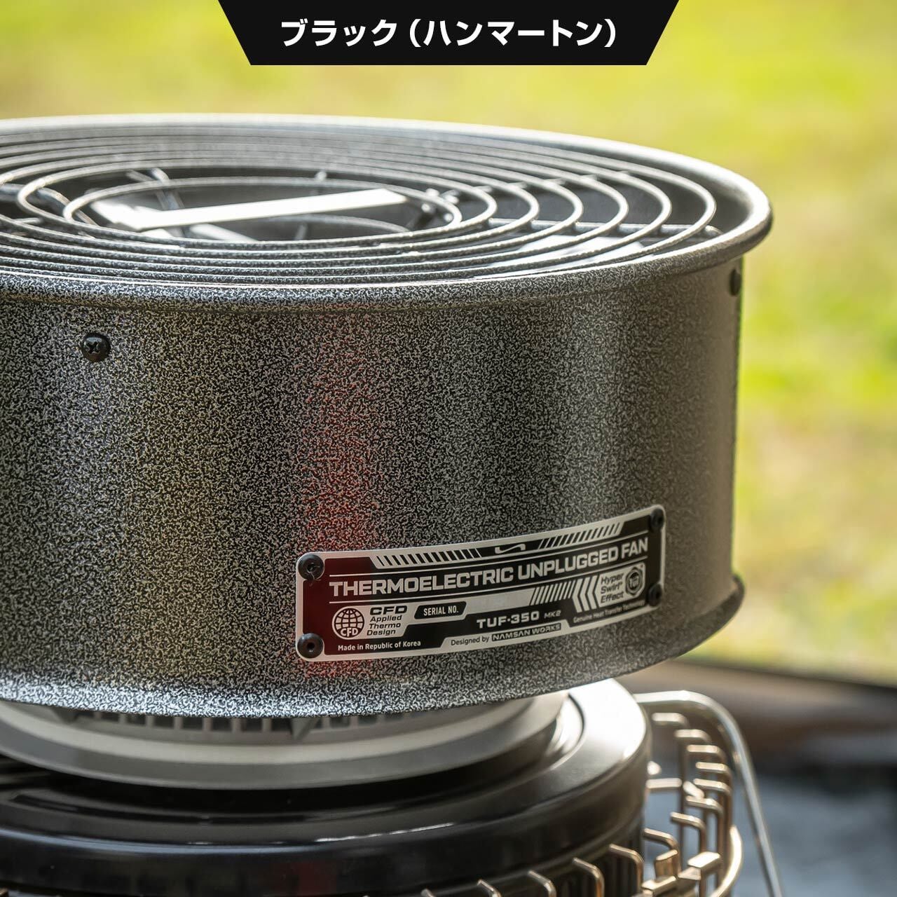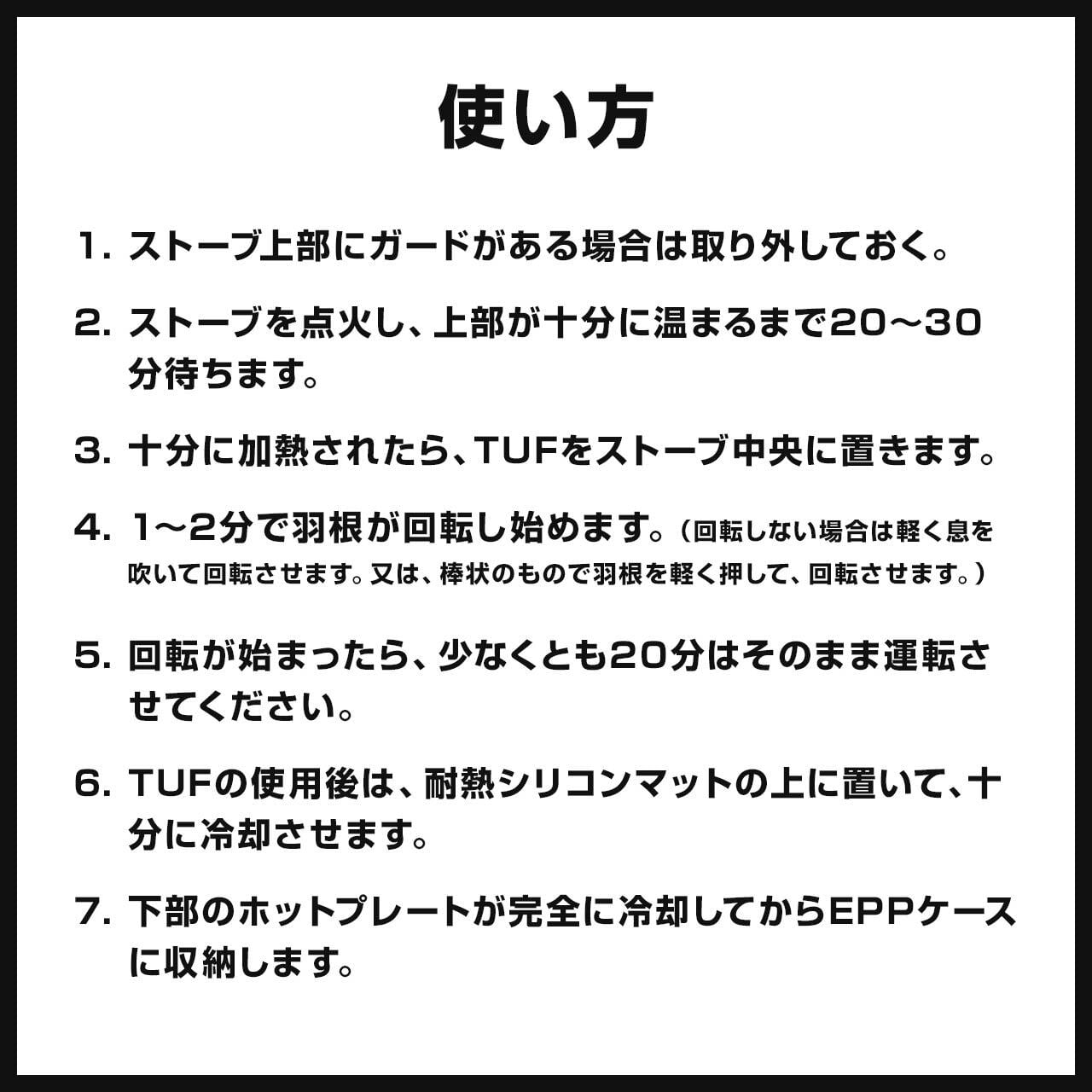 TUFはストーブの熱で発電して羽根を回す熱駆動ファンで、電池もコンセントも不要。